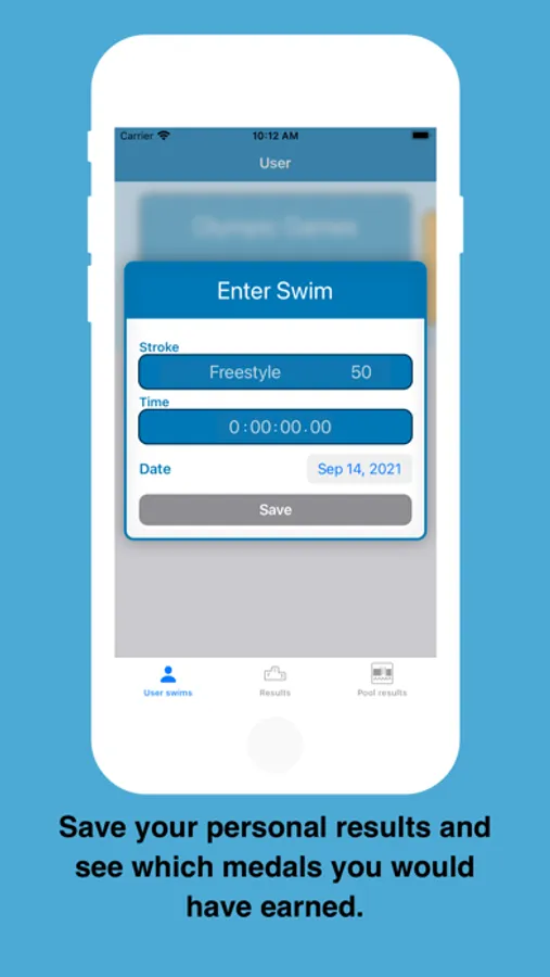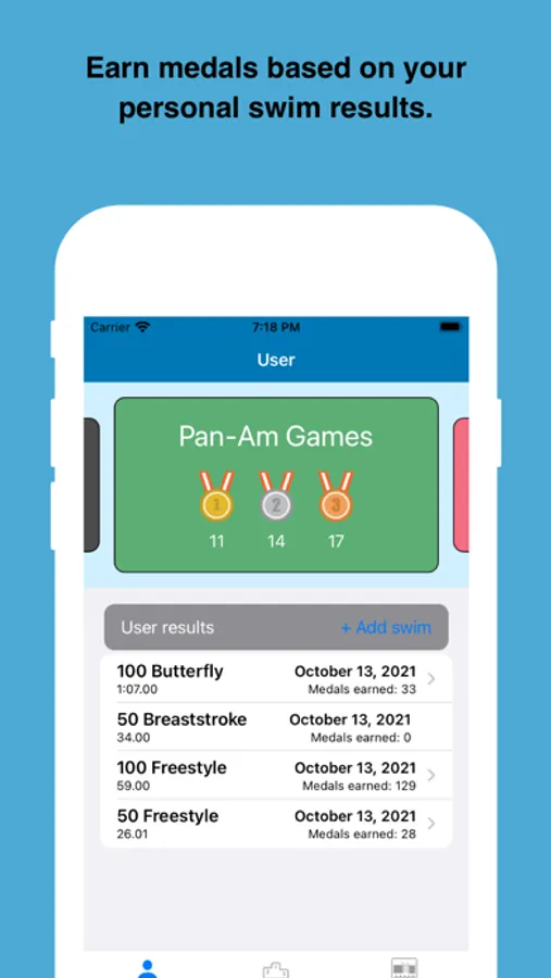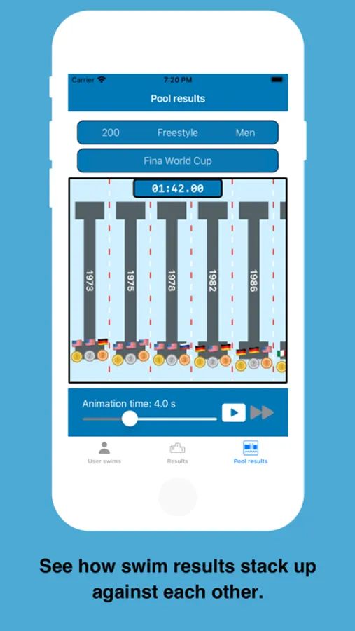 With Swim4Gold you can see previous swimming competition results and how they compare with each other and yourself. Challenge yourself in the pool to get faster and earn "medals" from real historic competitions!!