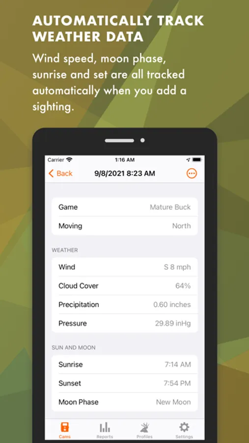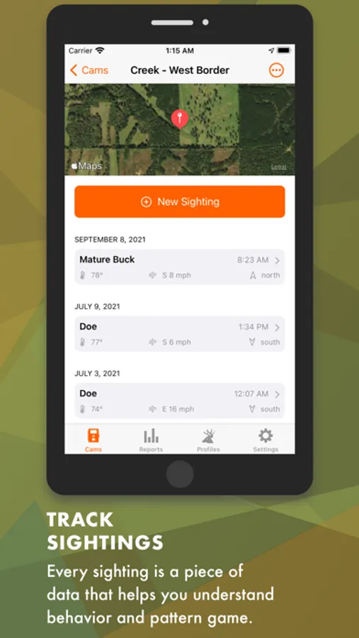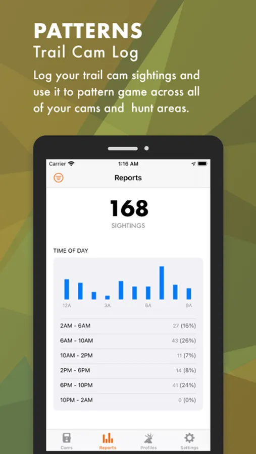 Patterns is a trail cam log that helps you store and track all of your trail cam sightings. Once you've got a collection of sightings tracked, you can use those to report on behavior and pattern specific animals.