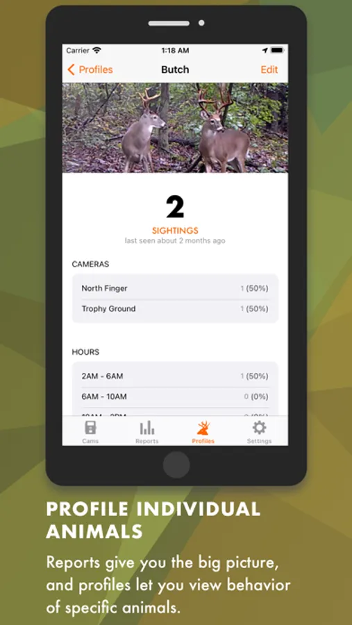 Reports: Profiles are great, but you can also report on specific hunt areas to see doe:buck ratios or report on individual cams to see when bucks are moving. Reports offer a lot of flexibility.