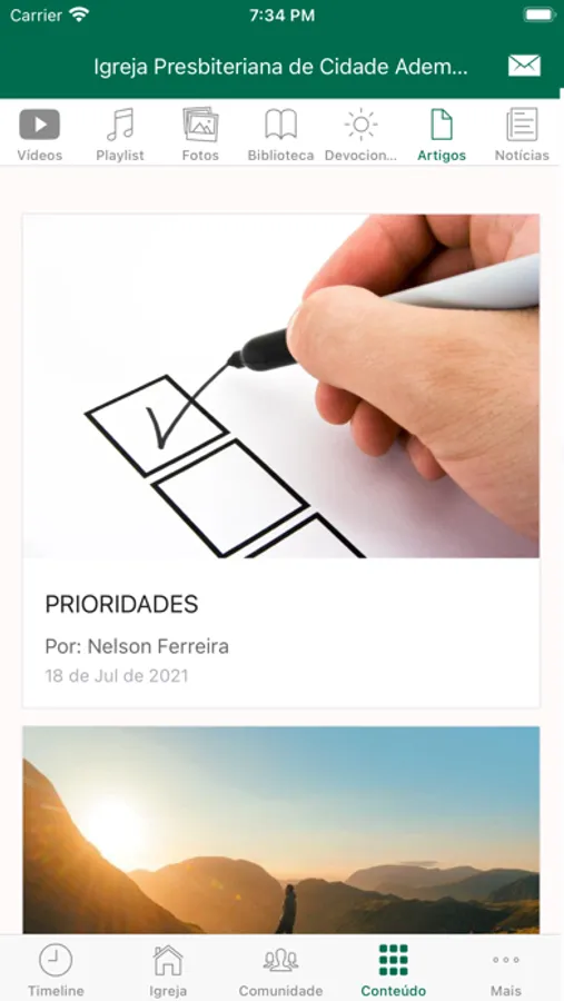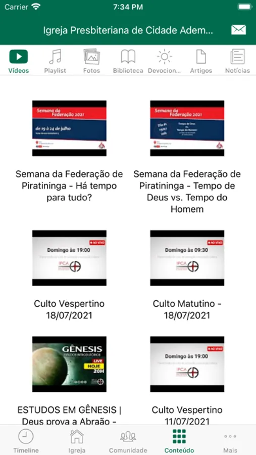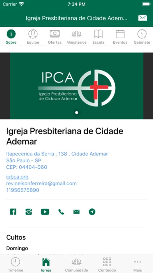 - Informações da Igreja (endereço, telefone, site, redes sociais, pastores)
