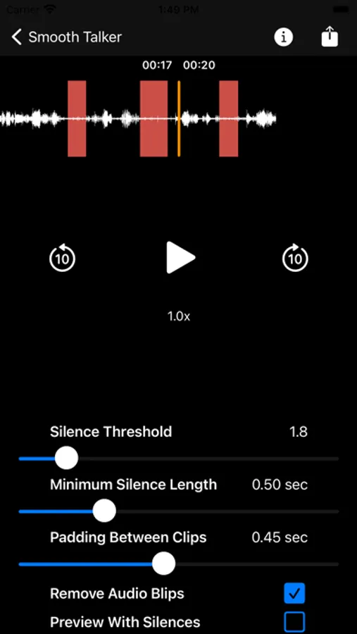 2. Adjust the settings: Silence Threshold, Audio Padding, Remove Blips, and Silence Lengths.