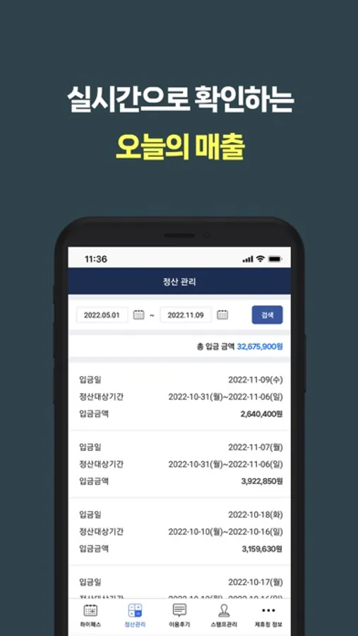 - 정산관리 : 하이패스로 인해 발생할 매출을 확인하고 정산을 확인합니다.