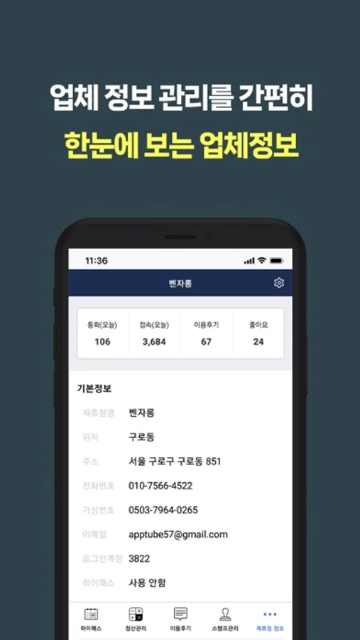 - 제휴점 정보 : 업체 정보를 확인하고 관리를 통해 상태를 변경할 수 있습니다.