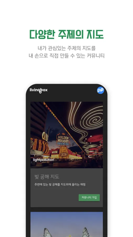 리빙박스는 다양한 커뮤니티매핑을 할 수 있는 위치정보 포털로서, 커뮤니티의 관심 주제별로 참여자들이 데이터를 직접 수집해서 다양한 시각화를 통해 분석할 수 있게 하는 온라인 커뮤니티사이트입니다 .