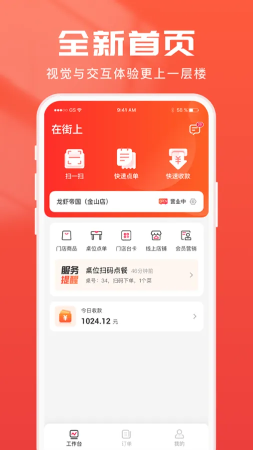 在街上餐饮是福建点石科技自主研发的餐饮实体店铺管理类工具,用来帮助餐饮商家进行支付、点餐、订座等餐饮业务,以及优惠券、会员、折扣卡、计次卡等营销活动的软件,帮助餐饮商家营销赚钱管理省钱。主要功能有: