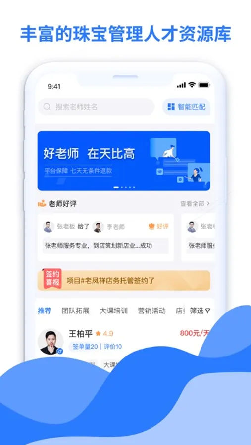 “天比高”为店务老师与门店经营者搭建起高效沟通、信息对等的公共平台。行业牛人可以跳过繁杂的线下寻找客户环节,实现直接与老板在线聊天、恰谈业务条件的高效方式,提升找项目的效率。同时,老板也可采用类似微信聊天的在线互动方式,与老师直接对话,展示自己的诚意,精准定位老师最优人选,将寻找老师的耗时成本缩短到最低。在“天比高”平台你可以获得丰富的项目和人才资源。