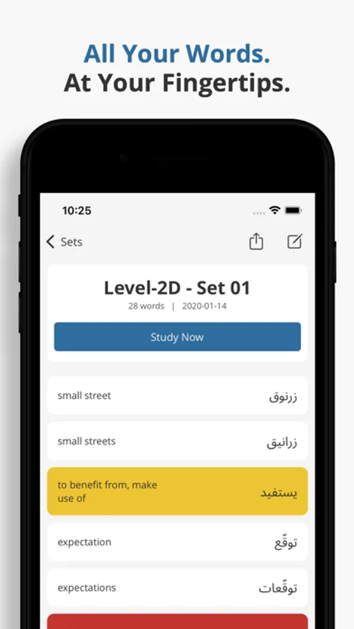 ◆ Create sets to hold words that you are studying in your Arabic language learning journey.