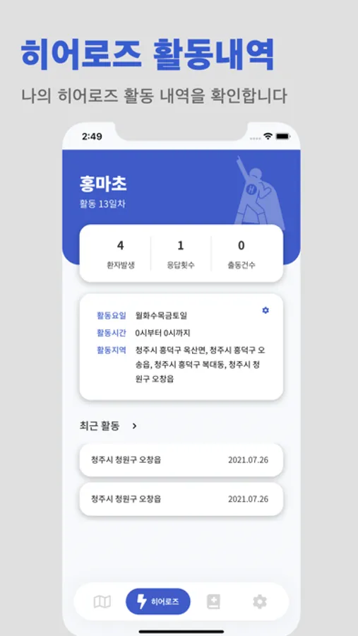 우리동네 히어로즈는 설정한 지역내에서 응급처치가 필요한 환자 발생시 소방에서 요청한 자원봉사자 지원요청 정보를 수신하여 신속히 현장에 출동하여 소방을 도와 환자를 처치 및 이송하여 우리 지역내 생명소생률을 높이기 위한 앱입니다. 응급처치에 대한 교육 콘텐츠 및 응급처치 관련 서포트 기능등을 제공합니다.