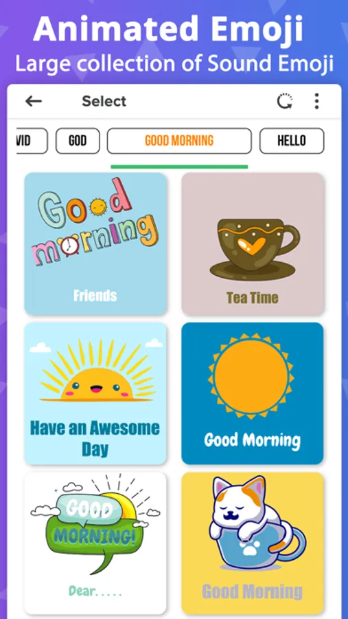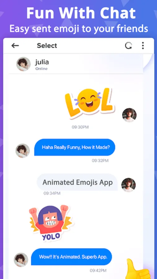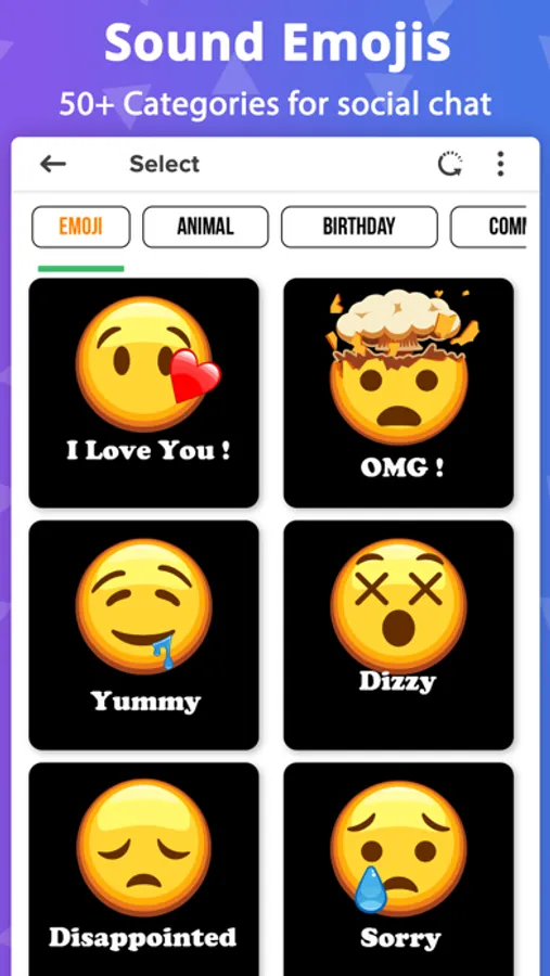 Get animated sound emoji for social chat app and use a large library of animated emojis with sound and voice in various categories compatible with any chat messengers. Choose your favourite emoji animation smiley to express your feelings and emotions on social!