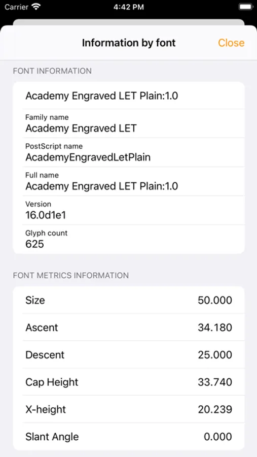 Full name, Family name, PostScript name, Version, Glyph count, Ascent, Descent, Cap Height, X-height, Slant Angle