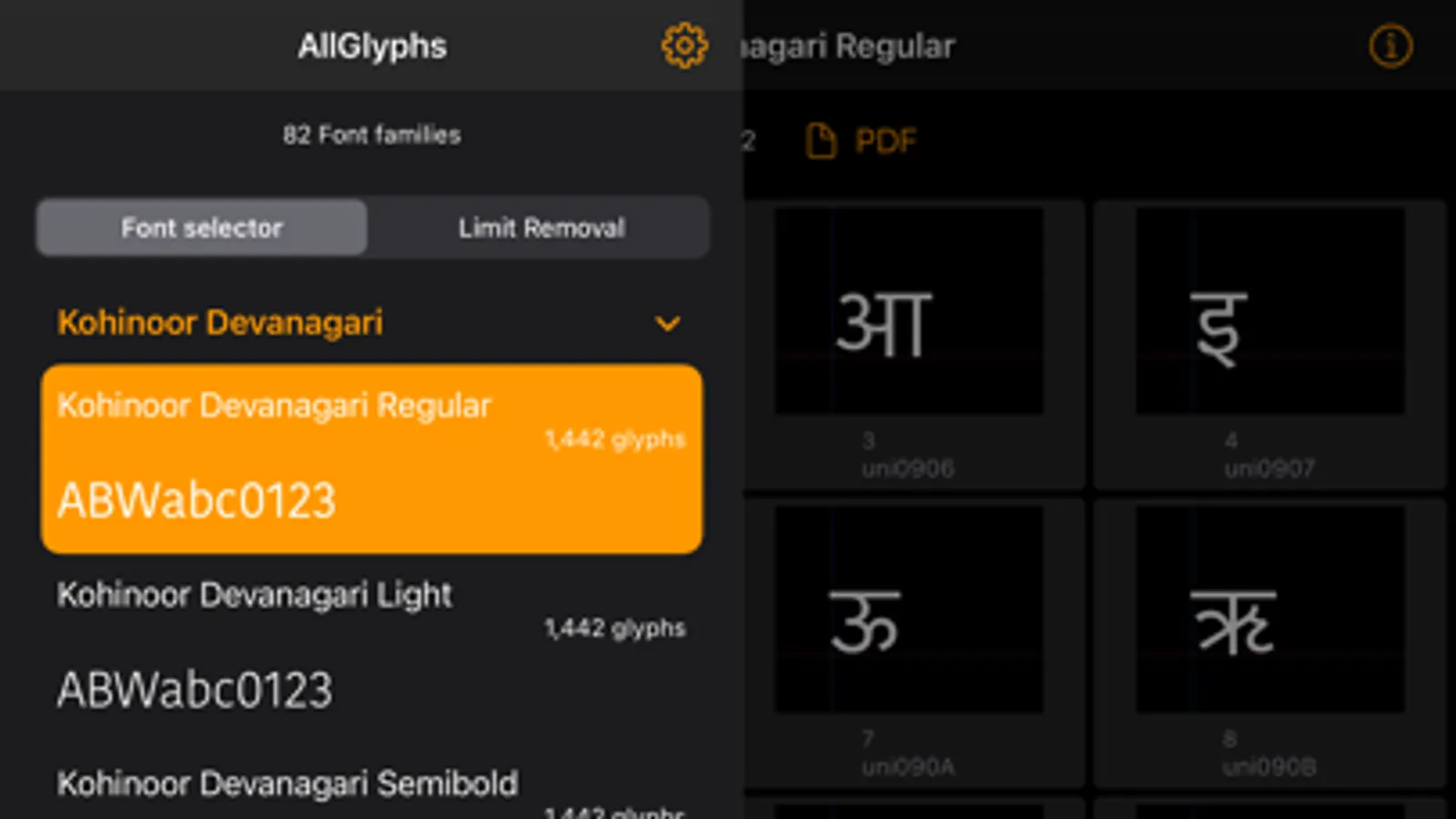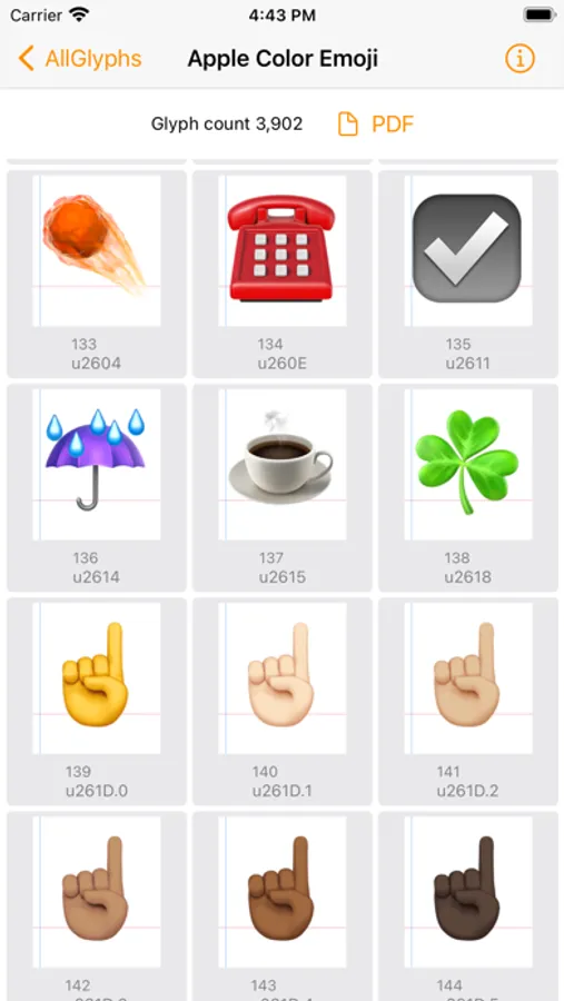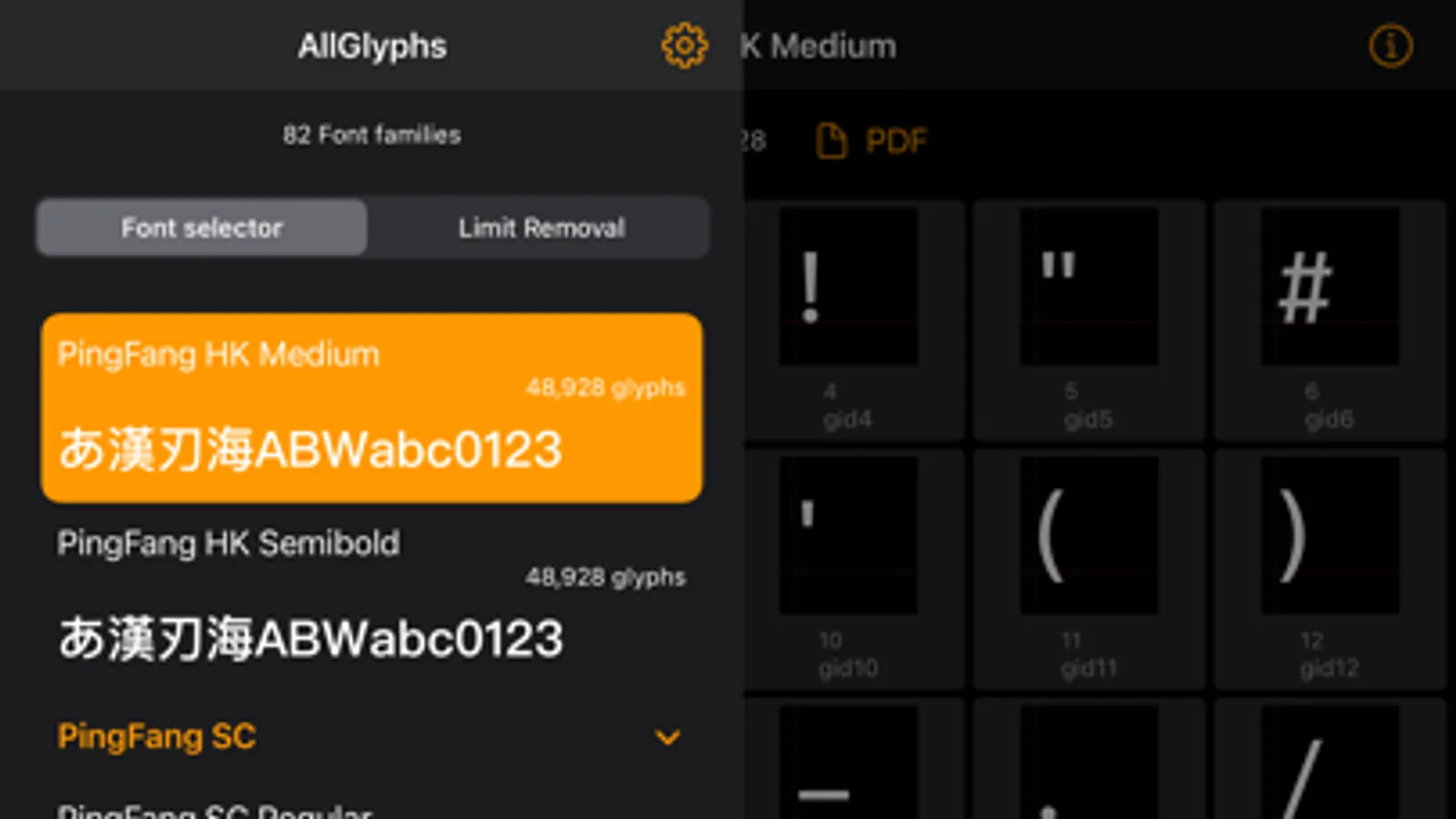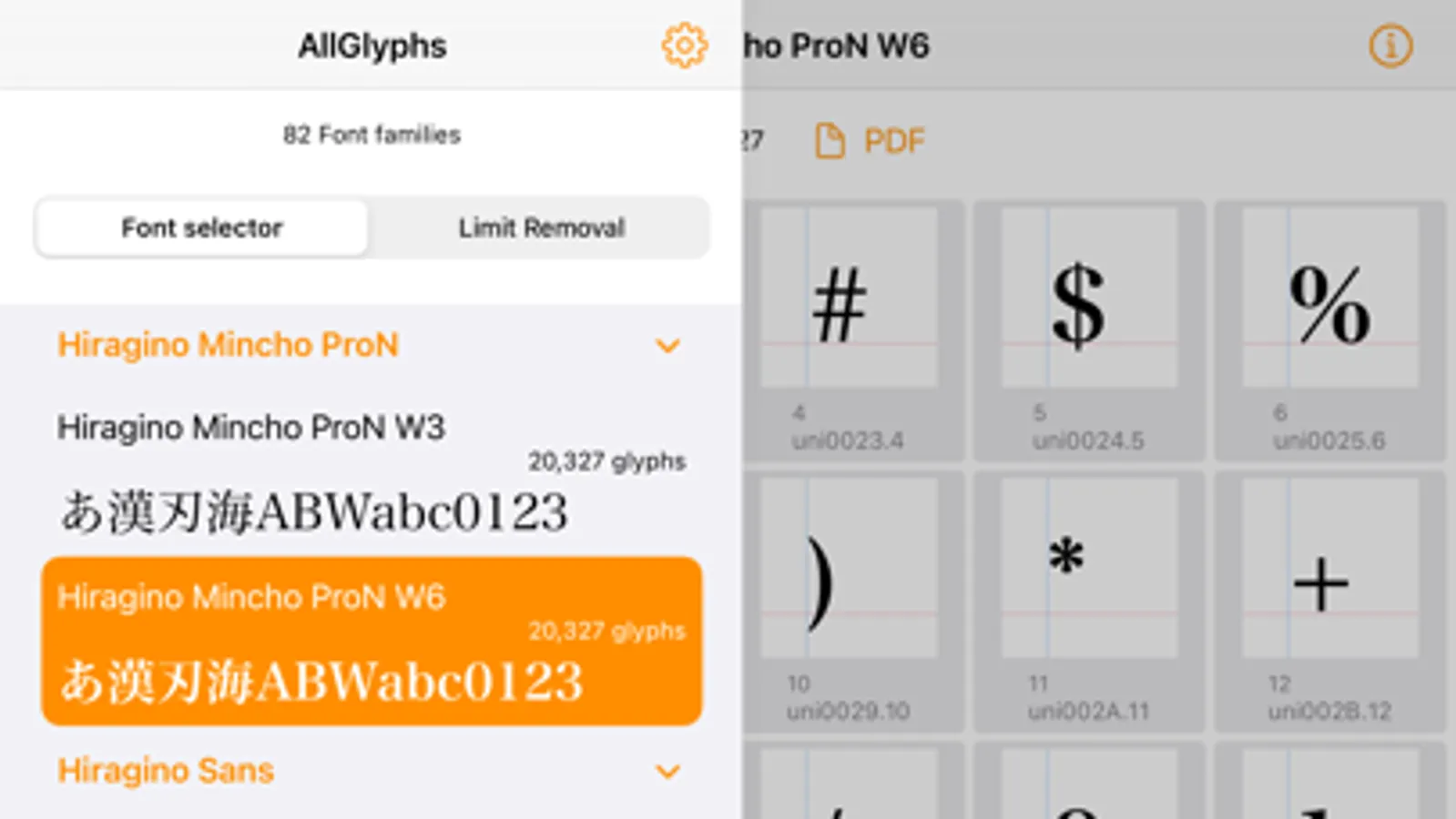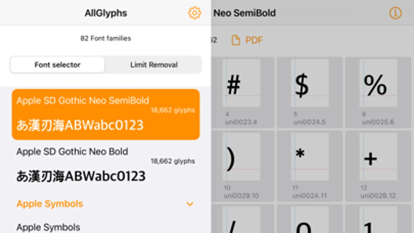 The app is free, but you can only view and PDF up to 150 glyphs for free.