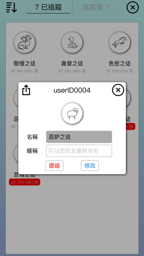 2. 追蹤好友:每個人都有獨特ID可以互相追蹤,且除了自己設定的名稱,還可以為對方設定暱稱。