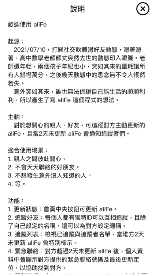 6. 失蹤推播:48小時未更新 aliFe 後,每6小時會通知該用戶追蹤者應立刻關心。