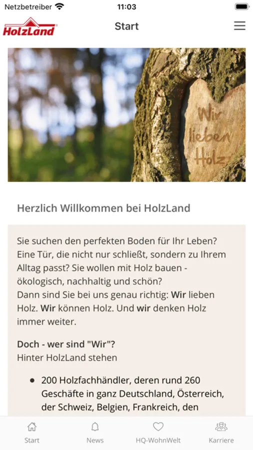 Sie suchen hochwertige Produkte für ein nachhaltiges Wohnen und Bauen mit Holz? Dann sind Sie bei my HolzLand genau richtig, der App der HolzLand-Kooperation. Im öffentlichen Bereich finden Sie jede Menge Infos über unsere Gruppe, unsere Mitglieder, unseren Holzhändler-Marktplatz holzland.de, unsere Eigenmarke HQ mit modernen Fußböden, innovativen Türen und Terrassendielen sowie offene Stellenangebote. Kurz gesagt: Auf my Holzland bündeln wir all unsere Informationen, Daten, Neuigkeiten und Kampagnen – übersichtlich, schnell und transparent. My HolzLand ist unser Intranet für die Hosentasche und zentrales Element unseres digitalen Selbstverständnisses.