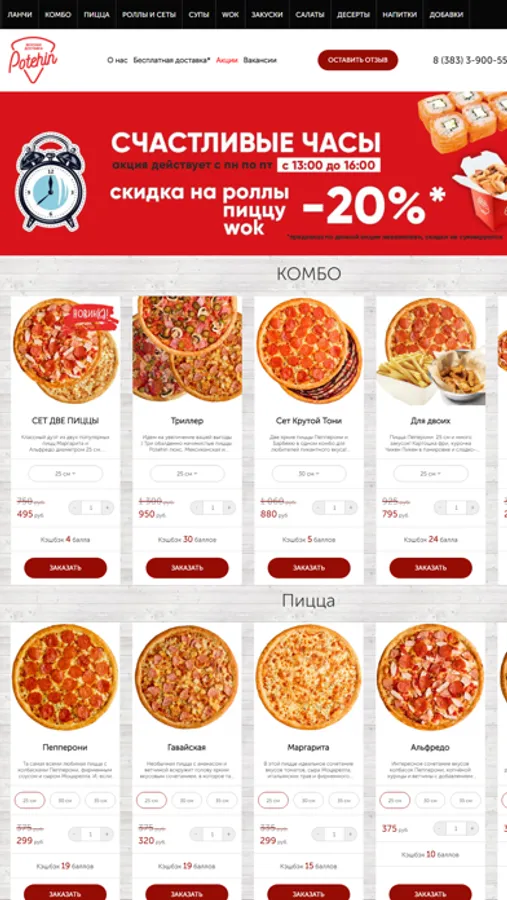 В приложении Potehin food вы всегда сможете заказать пиццу, роллы, суши, салаты, супы и многое другое. В приложении всегда актуальные акции и скидки.