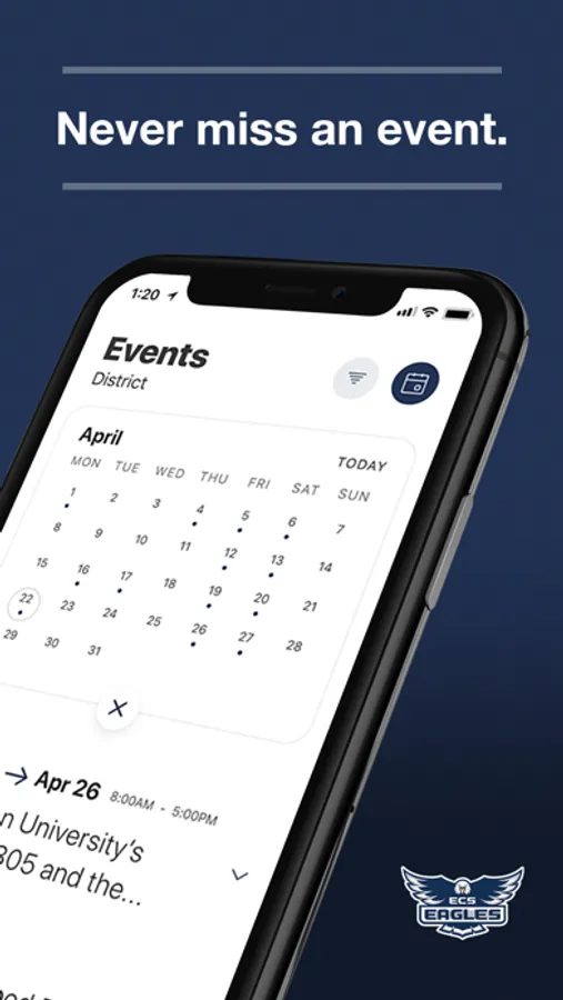 The event section shows a list of events throughout the district. Users can add an event to your calendar to share the event with friends and family with one tap.