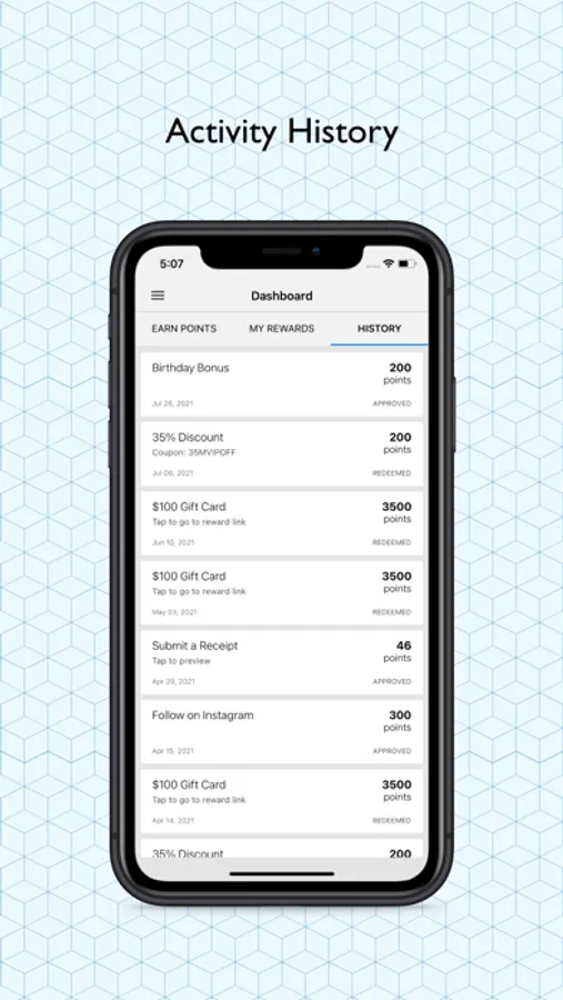 -Transaction history for the points you’ve earned for uploaded receipts