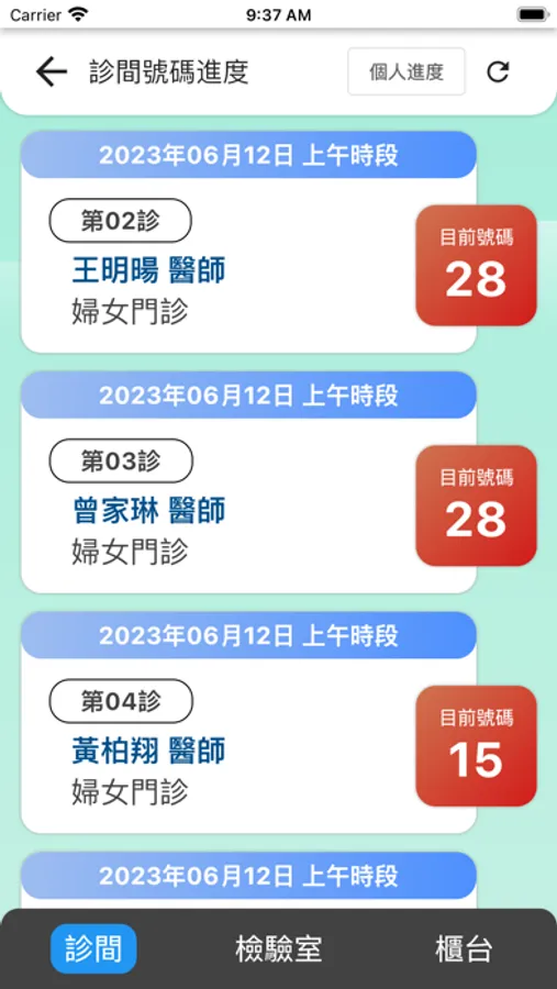 3. 看診進度: 可依科別查看目前燈號或點選親友查看當日的看診進度。