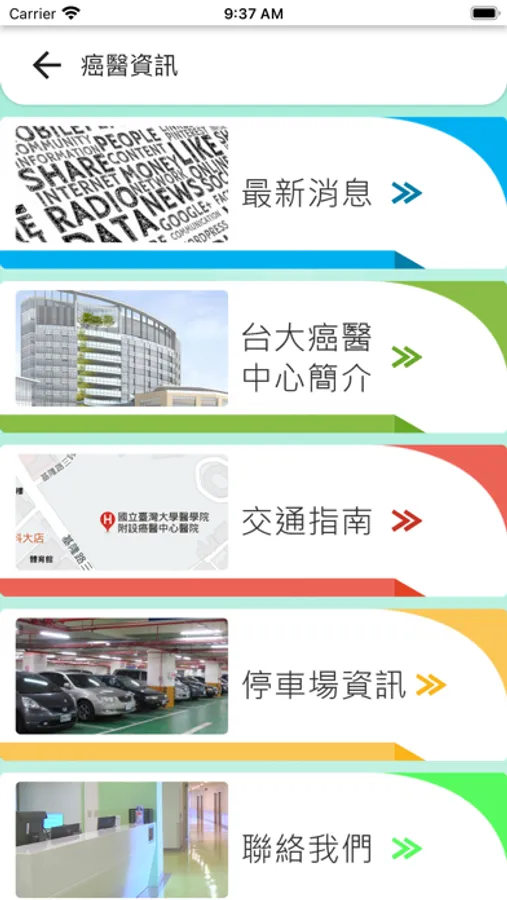 5. 癌醫資訊:可查詢癌醫分院最新消息、癌醫簡介、癌醫交通指南、停車場資訊…