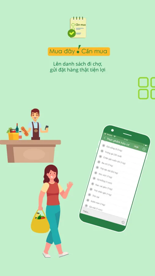 Mua đây! Ứng dụng giúp nội trợ lên danh sách cần mua khi đi chợ và gửi đặt hàng. Nhờ vậy, bạn không bỏ sót thứ cần mua mỗi lần đi chợ hay đặt hàng online.