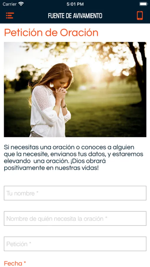 El App movil “Iglesia Fuente de Avivamiento” tiene como fin ser un canal de bendicion para todas las personas que asistan a nuestra iglesia y deseen ser parte de nuestra comunidad donde el amor de Dios esta sobre todas las cosas. Aquí encontraran alimento para el alma, calendario de nuestros eventos, formulario de peticiones de oracion, conectar con mas personas de la iglesia y mucho mas.