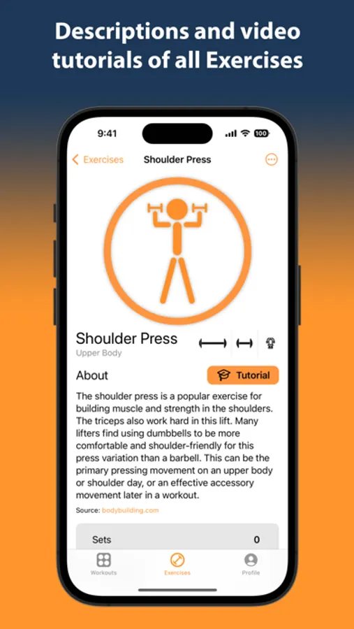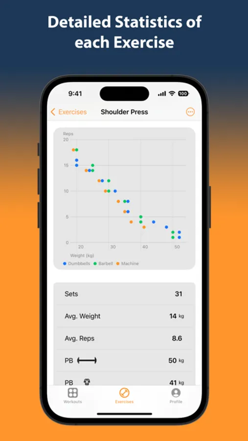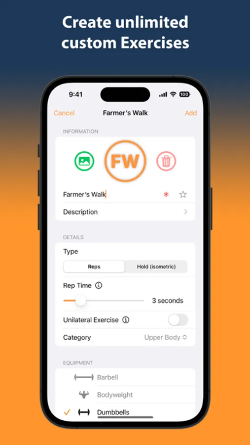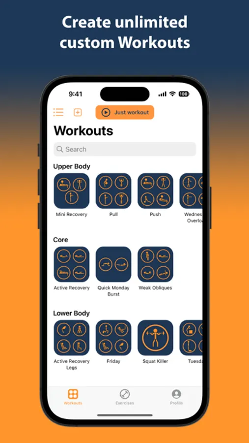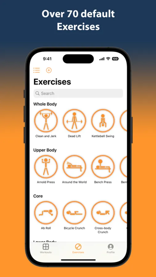 Create an unlimited number of workouts from a wide range of over 70 exercises included. Can't find an exercise? You can create custom exercises and edit included exercises to suit your needs.