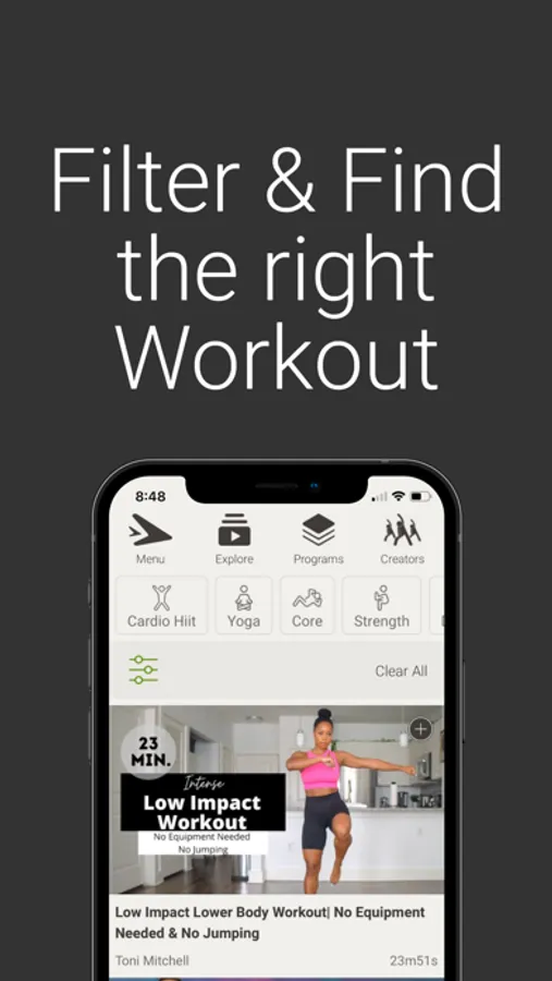 Streamline workout discovery by creator, workout type (HIIT, Yoga, Strength, Dance, etc.), length of workout, and equipment requirements.