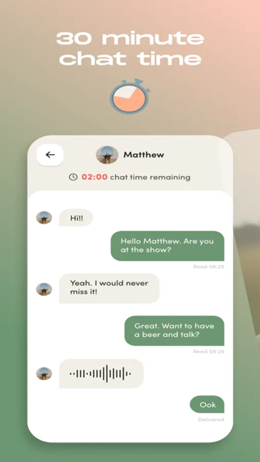 Zown creates an exciting environment where each connection starts a 30-minute chat. The chat timer prompts you to coordinate and set a meeting point in real life, giving this new interaction a real chance. With the way the app is structured, the need for endless swiping and no-end online conversations is removed, creating an exciting sense of urgency and adventure!