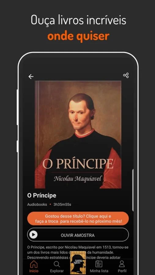 Não gostou do livro sugerido? O primeiro livro não pode ser substituído, mas depois você pode trocar por outro até a próxima data de entrega que é informada nos detalhes de sua assinatura em ‘Minha conta’. Ouça prévias dos livros disponíveis em seu plano e escolha qual quer receber no mês seguinte.
