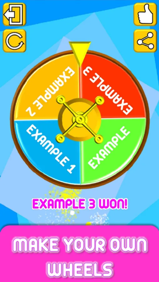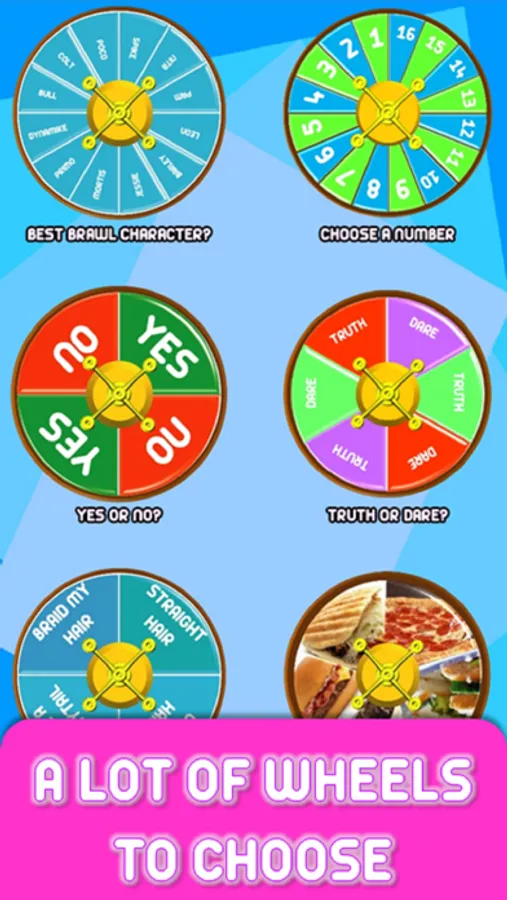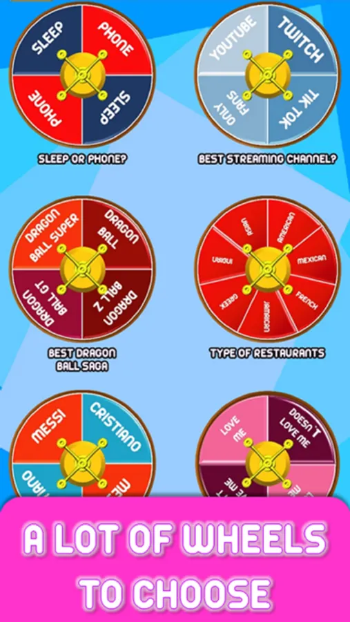- Premade spinner wheels such as: Yes/No, Love Me/Doesn’t love Me, What to eat and much more