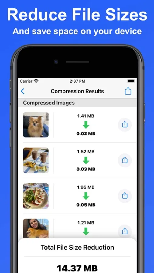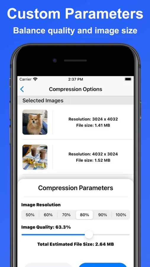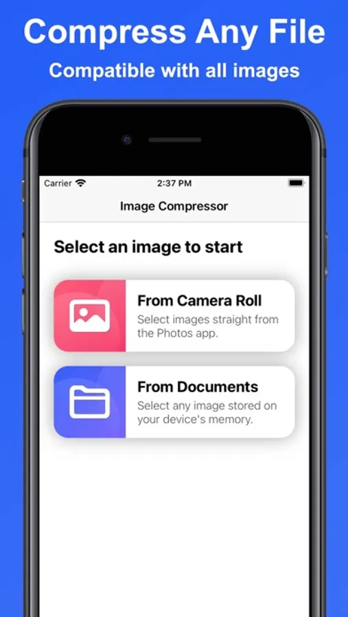 Compressor works 100% offline so your data is never sent to the internet or shared with third party services in respect to your data privacy. The whole compression is done on device.