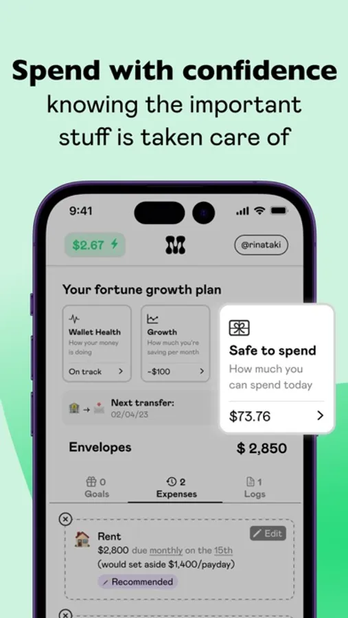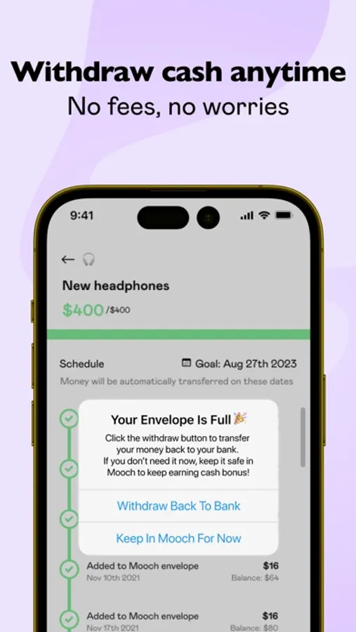 Link your bank to Mooch and you'll unlock a personalized fortune growth plan designed to help you live your best financial life. Say goodbye to worries about future expenses as you effortlessly set aside money inside your Mooch Wallet. With automatic savings goals, your wallet will grow steadily with every payday. Plus, earn cash back each month on every envelope you create for your expenses and savings goals. Here are 10 reasons why Mooch is the ultimate wallet for your financial journey: