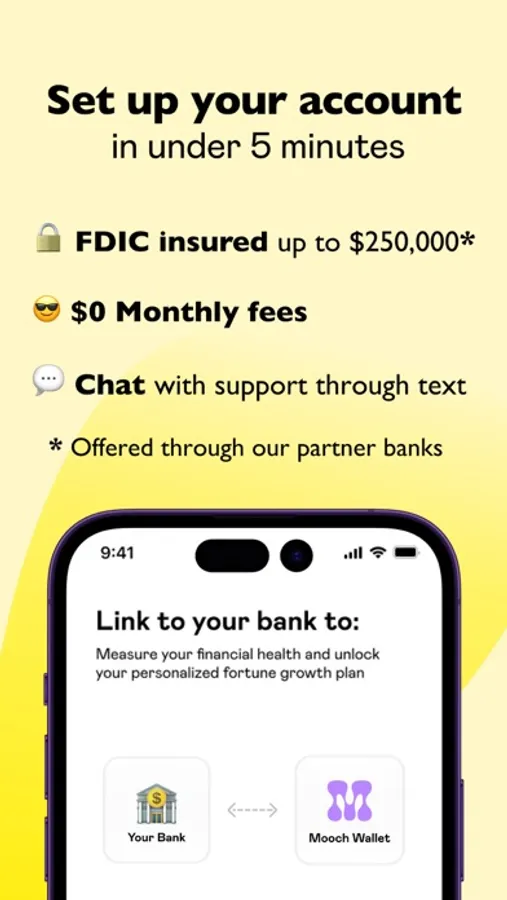 2) Secure Money Storage: Protect your funds from impulsive shopping sprees with the Mooch Wallet. Our fee-free wallet app offers a secure way to store your money, with deposit accounts FDIC insured up to $250,000 offered through our partner banks.