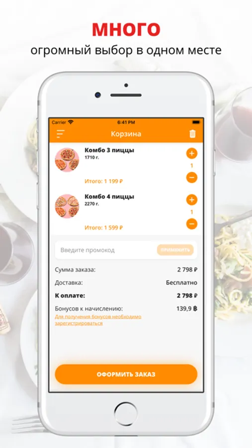 Заказ еды на дом ещё никогда не был таким удобным и быстрым. Все заказы мы принимаем через наше приложение. Мы не вводим никаких дополнительных условий: у нас бесплатная доставка при заказе от 800 рублей.