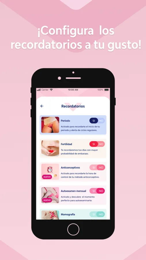 Para activar los recordatorios tienes que registrarte e ingresar tus datos. Una vez registrada, debes ir al menú inferior y en el botón Perfil, le das clic a Recordatorios para activarlos. ¡Será rápido!