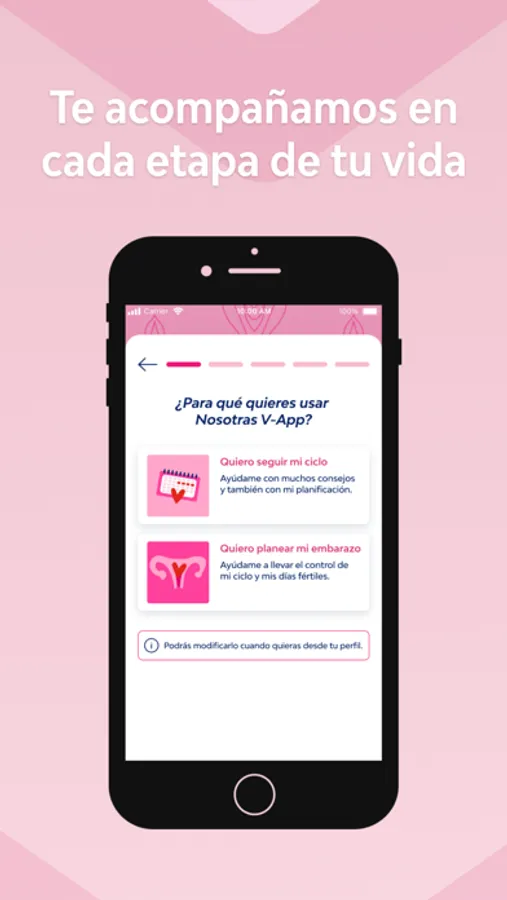 Si quieres quedar embarazada, configura V-App para que te ayudemos a identificar tus días fértiles y conocer algunos de los síntomas asociados. Esta configuración puedes modificarla cuando quieras, según tus necesidades.
