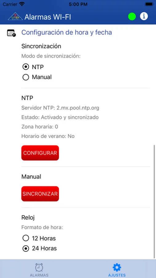 - Selección de formato de hora del reloj (24 ó 12 horas).