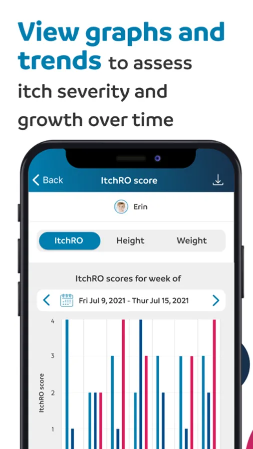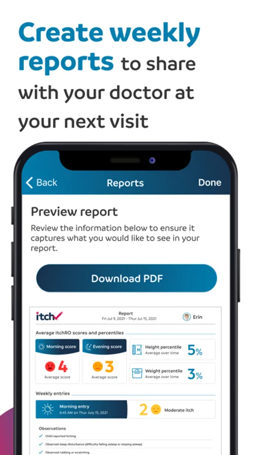 3. Share reports to keep your doctor in the know: Be better prepared for your next doctor’s visit with a weekly report generated by ItchCheck and available for you to download at any time. Reports include average itch severity, growth percentile data, photos, notes, and more.