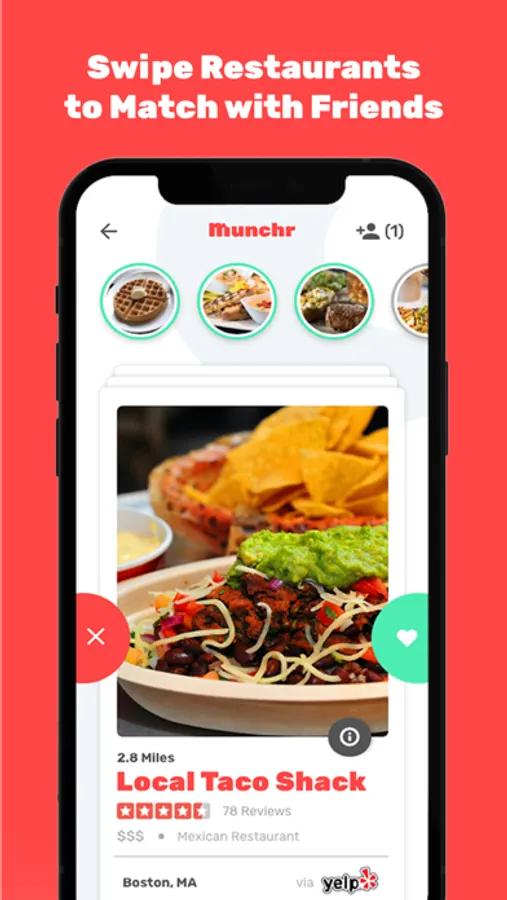 Munchr makes it easy to find nearby food that everybody likes. Stop arguing with your friends/family/significant other about where you're going to have dinner, and start swiping to find matches instantly!