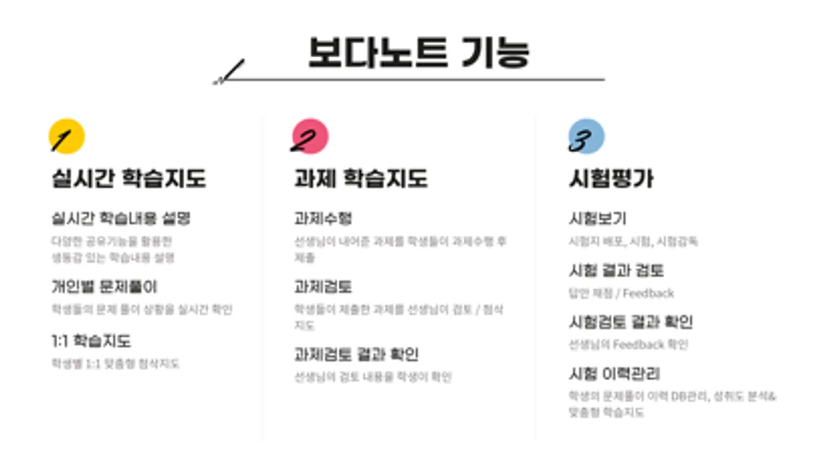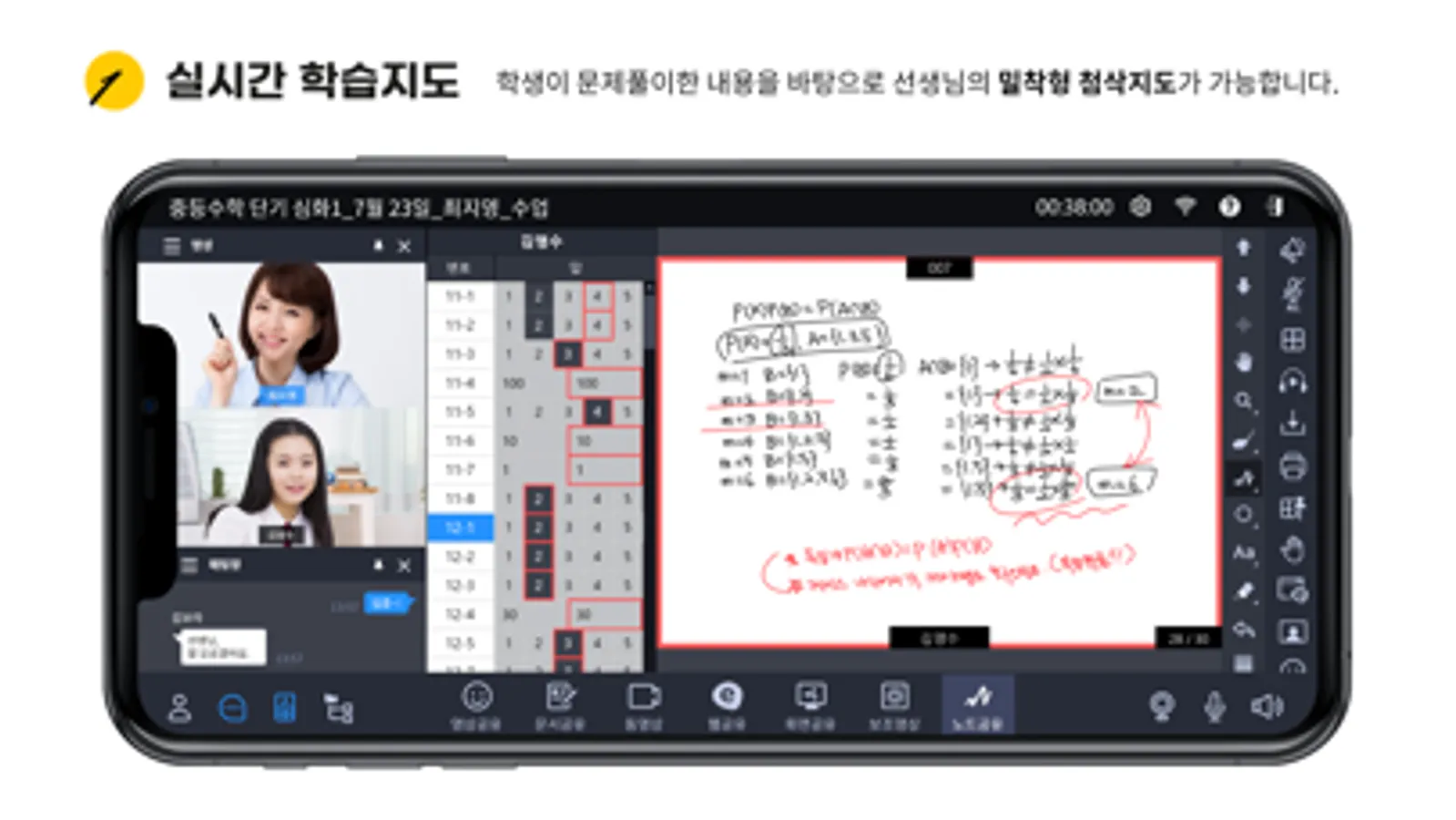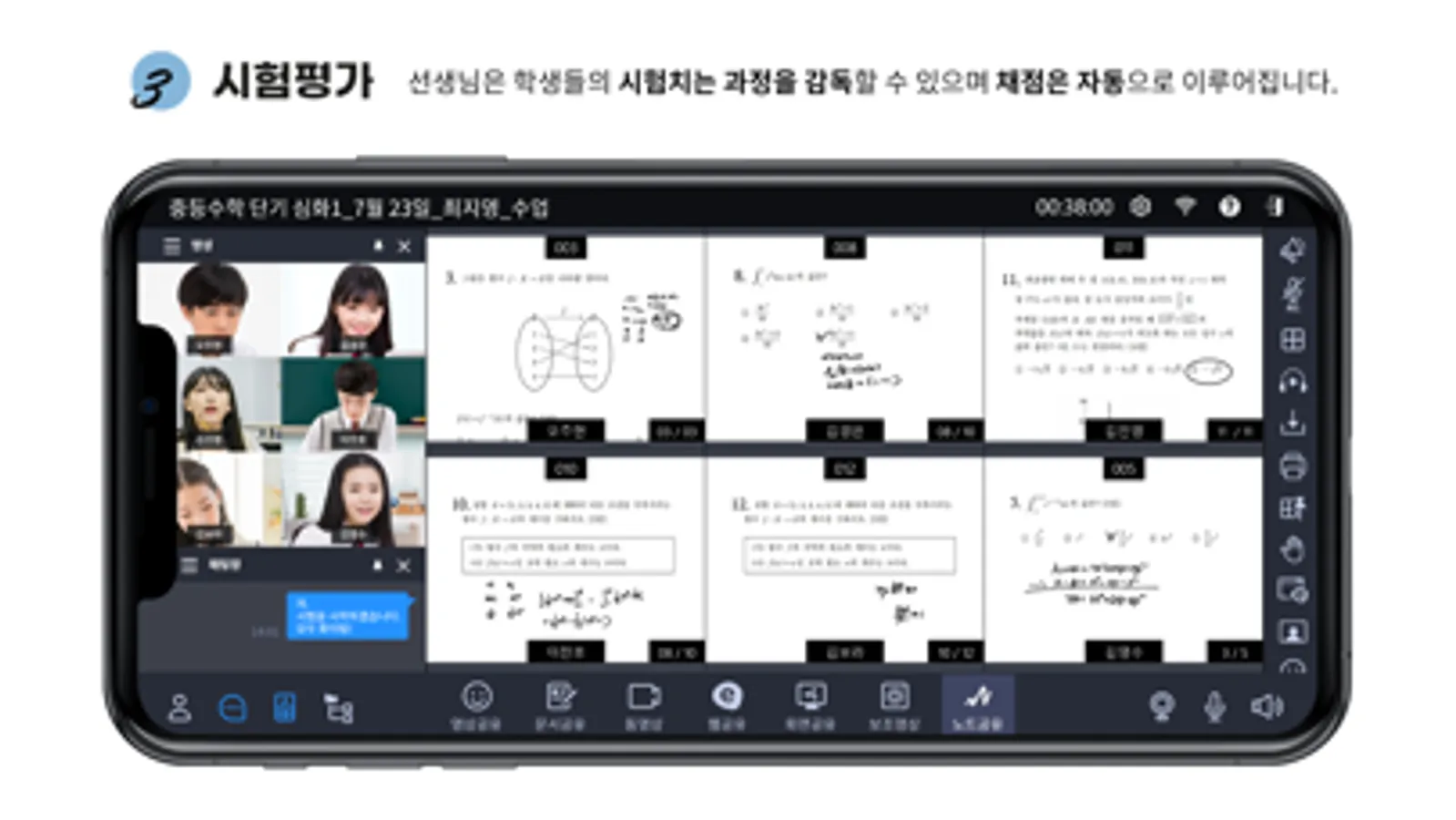 실시간 영상과 음성 데이터 외에도 학생들의 필기 데이터를 활용하여 전체 학생들의 문제풀이 과정을 보며 실시간으로 지도할 수 있고, 학생들이 제출한 숙제를 검토하고 첨삭 지도할 수 있으며 또 시험평가를 진행할 수 있습니다.