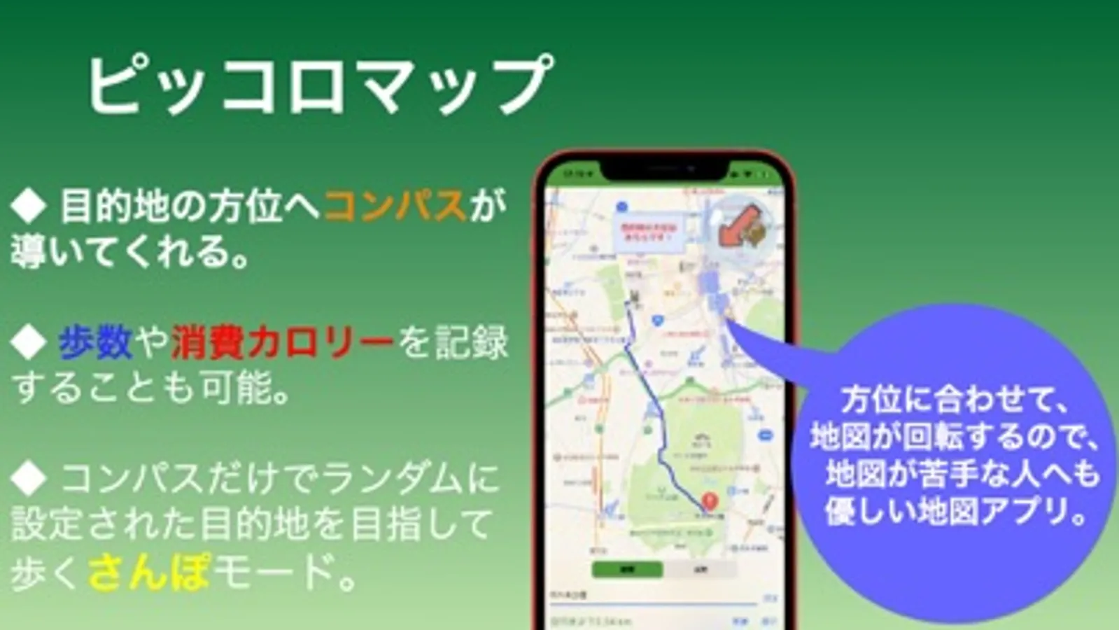 目的地を指すコンパスと残距離のみを頼りに、気ままに歩きたい時に使ってください。