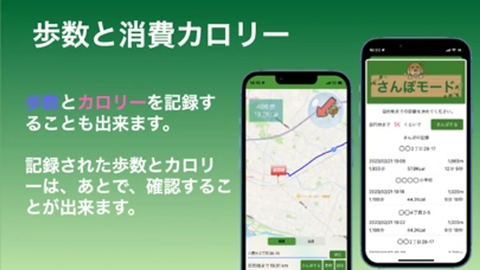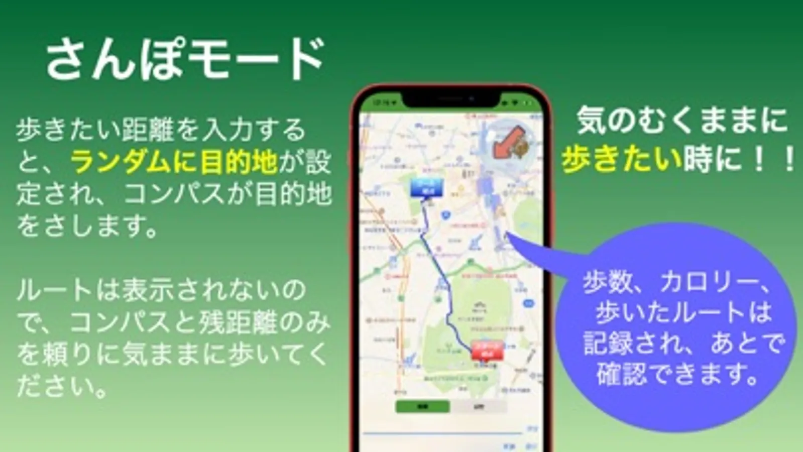 「さんぽモード」では、歩きたい距離に合わせてランダムに目的地が設定され、目的地までのルートは表示されません。