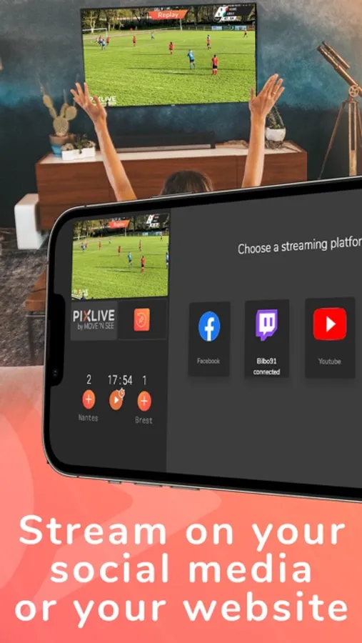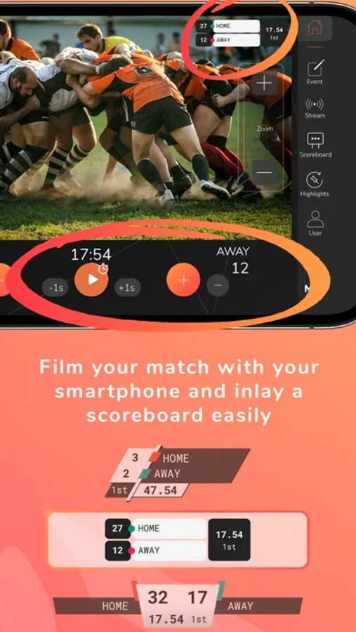 Film and stream all your games (any sports) with your smartphone with a nice scoreboard, share short extracts of the best plays on social media or even replay them during your live stream!