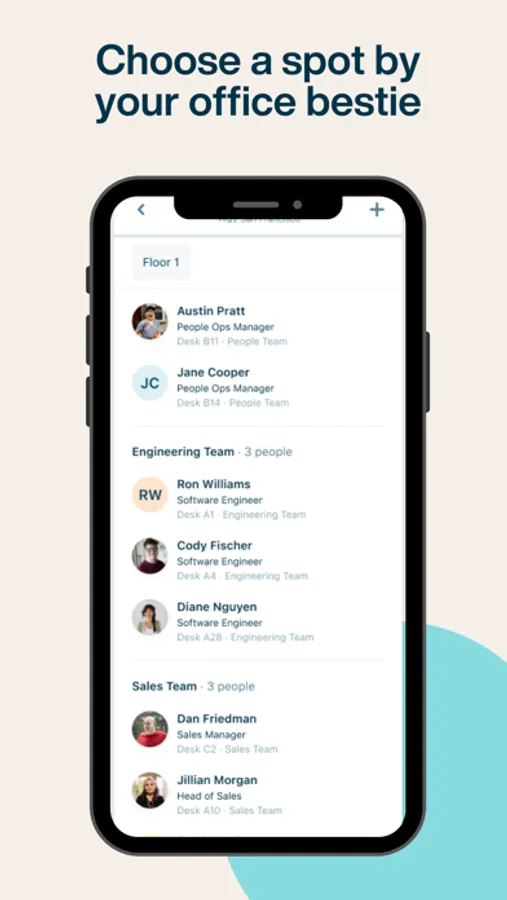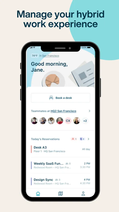 Book a desk at your office on the go—either same-day, or in advance. Easily see when others will be in the office, and book desks near teammates you need to collaborate with.