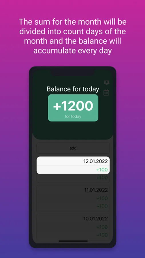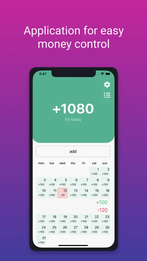 Application for easy money control. You can set up maximum amount you can spend per month. This sum will be divided into count days of the current month and the balance will accumulate every day. Every day you can add spendings what will reduce balance.