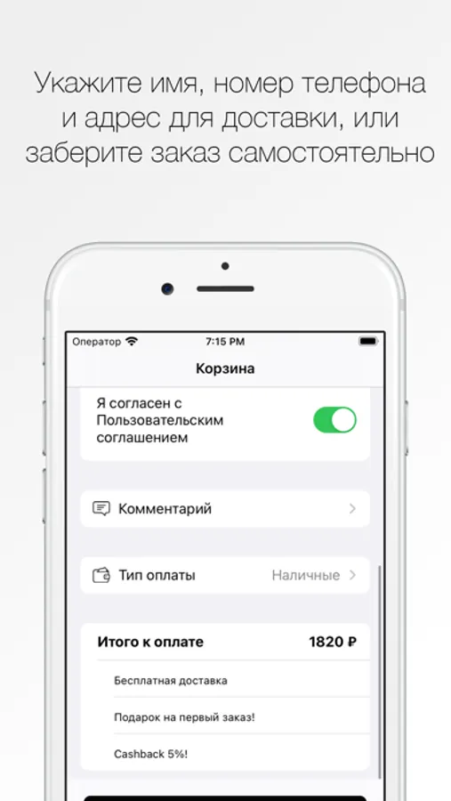 На экране заказа добавьте свою контактную информацию для первого заказа: Имя, Номер телефона и адрес электронной почты, чтобы получать уведомления об оплате.