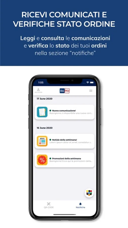 Grazie alle sue funzionalità potrai avere il tuo QR code personale, ricevere notifiche di comunicati e visualizzare lo stato dei tuoi ordini.