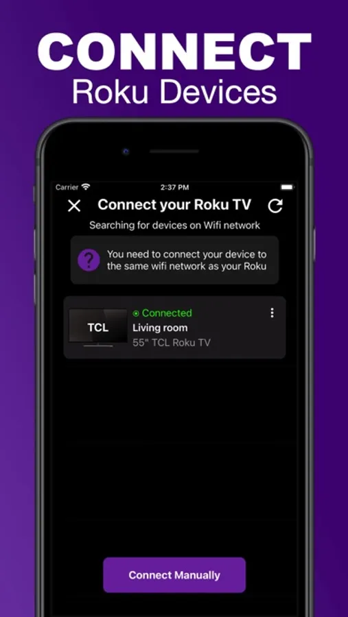 You need to connect your device to the same wifi network as your Roku. The application automatically detects the device to remote. or You can set up TV manually with IP address of your Roku