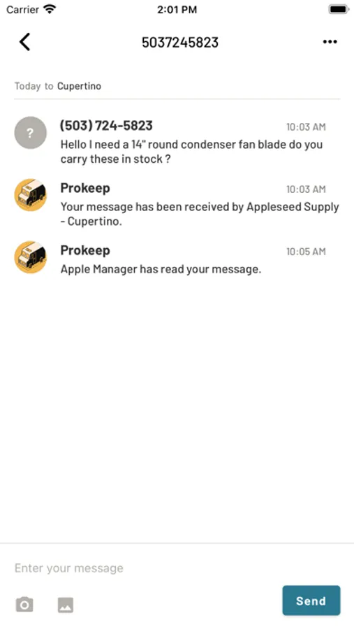 Prokeep text-enables your location's phone number, allowing contractors to text orders, questions, and pictures to the same number they’ve been calling for years. Your team can then field these messages from their counter computers, or even from home. And now with the Prokeep App, your team can field these messages from anywhere.