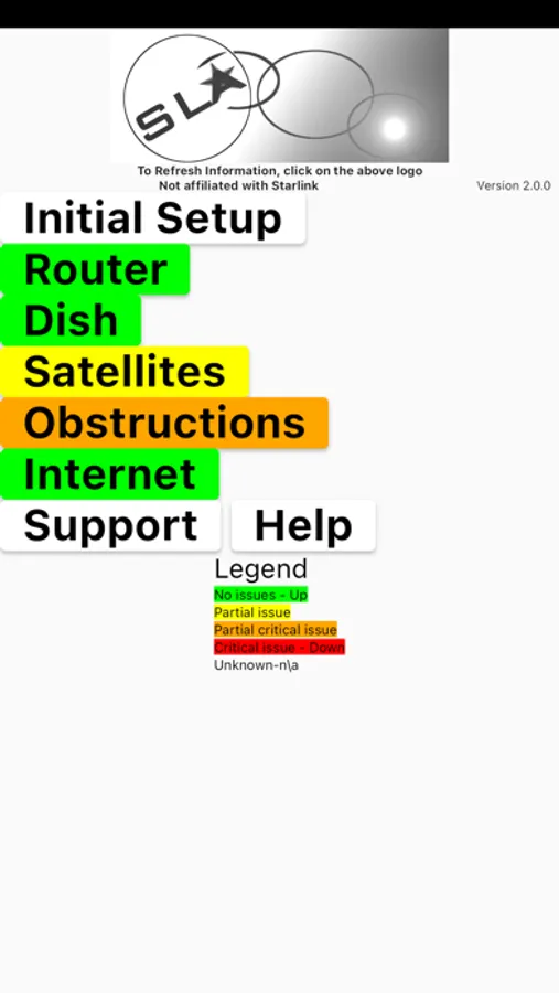 I wrote the Starlink Assistant App(SLA) because integrating the Starlink System into my home Internet system was a bit difficult. Another reason is that seeing how the Starlink system works is great fun. I want this app to help everyone identify and fix issues, use, and enjoy Starlink. The app uses color images and help pages to assist you navigate through most issues. The main page displays general information about how it is performing.